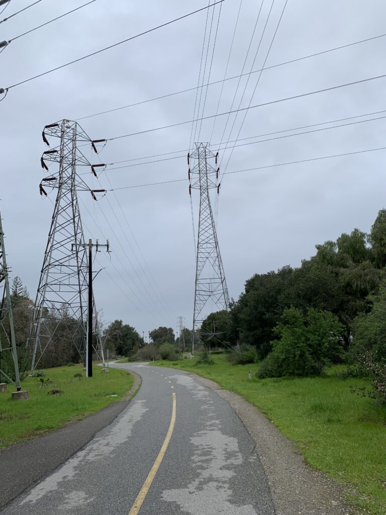 This is a picture I took on the Stevens Creek Trail. In this picture, you see the small details on the ground, like pebbles, grass, small tree stumps, bushes, and bollards. But if you just slightly adjust your view, you are confronted with the looming telephone and electrical towers, that make everything below them seem even smaller.