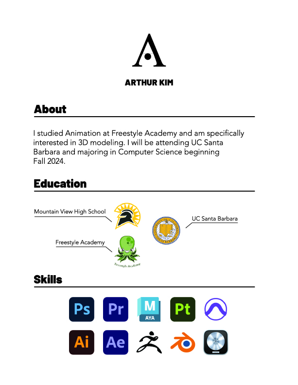 Hello, my name is Arthur and I was a student at Freestyle Academy. During my time at Freestyle, I enjoyed creating anything related to digital media, design, animation, and music production. I also spent time developing games because it combines a lot of different skills into one project, including game design, storytelling, art, and programming. My music and game development projects can be viewed under the “Personal Projects” tab.