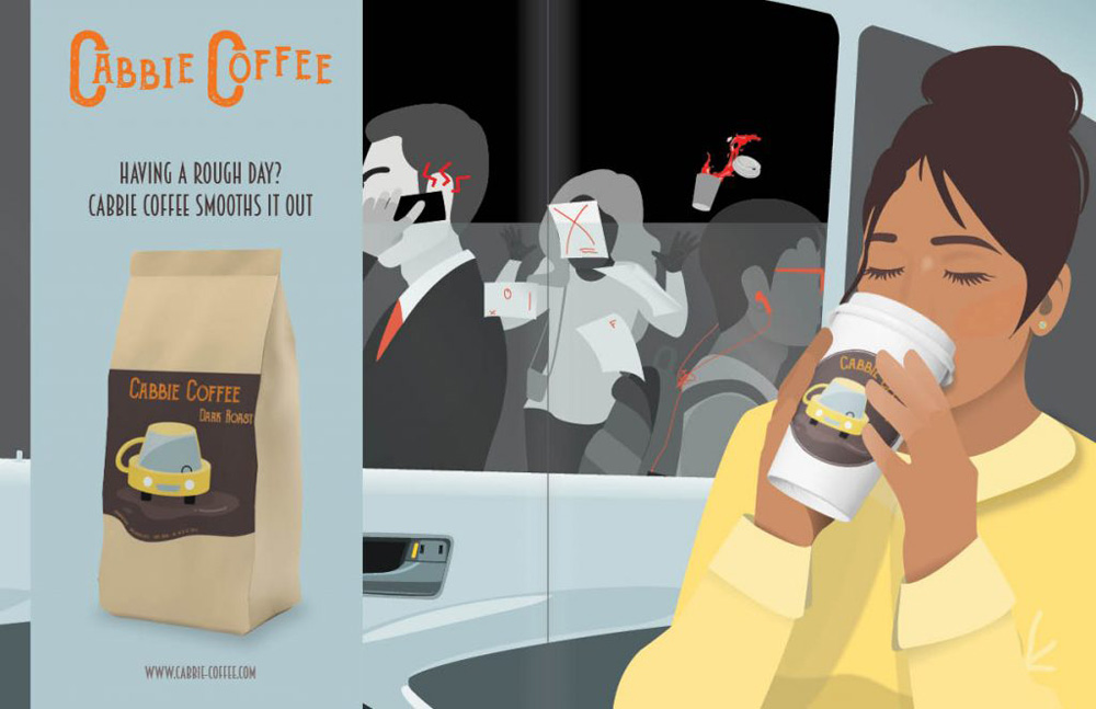 I was inspired by Art Nouveau to include a die cut in my label; die cuts emphasize lines and details well and add an organic element to geometric shapes. Due to my desire to have a die cut, I made sure to design my logo with lines in mind. Since the company is called “Cabbie Coffee,” I thought that the brand would be better geared towards younger people and therefore drew my logo in a modern, cartoon style. My color palette is deeply saturated and my lines dynamic to convey an energetic and urban feeling. I chose a roughly textured font to contrast the minimalism in the rest of the label.
