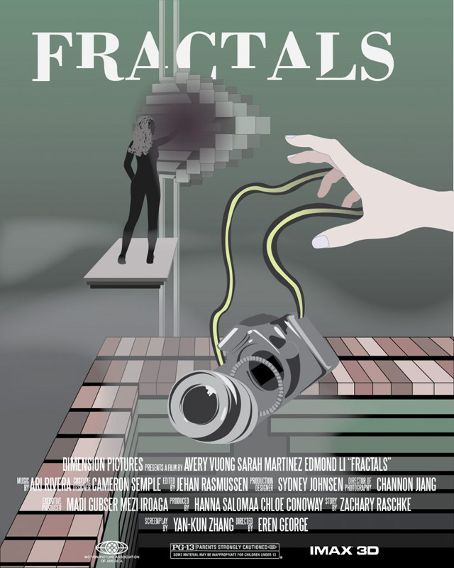 The synopsis of the story that I invented for “Fractals” is as follows: The protagonist, a photographer, goes at night to explore an abandoned hospital and gets cool shots. Strangely enough, one of the operating rooms has all of the medical devices and lights on. The second that the protagonist touches the operating lamp, a ripple travels through everything. Spooked, the protagonist runs out only to find that the hospital is not the same as it was before, and the same operating room is gone. Fragments of a hospital from the past, present, future, and from other dimensions have taken over, and the protagonist gets increasingly lost. Each time she touches a fragment, some of her soul gets left behind. She must find a way to escape without losing herself in another dimension. The scene I depicted in my movie poster is where the protagonist tries to photograph what she doesn’t realize is a portal, leading to her arm and camera being transported into another dimension. I created my movie poster art in Adobe Illustrator after sketching it in my notebook and edited the title block (at the bottom of the poster) in Adobe Photoshop.