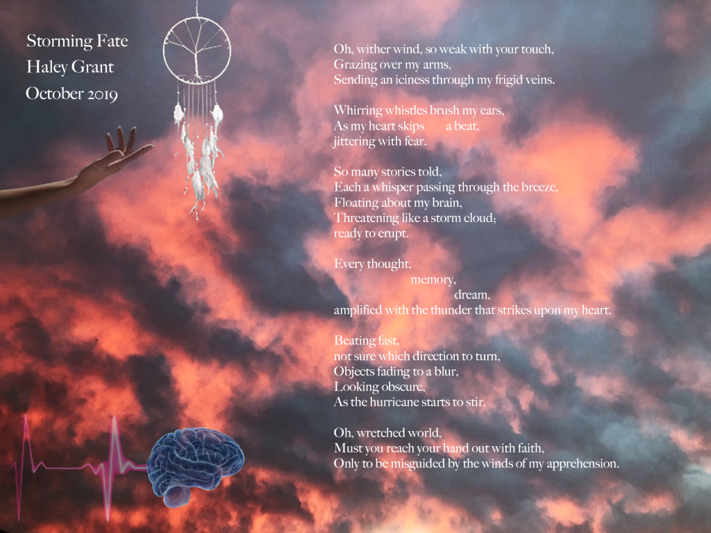In English, we drew two pieces of paper, one piece from each bag. One bag was labeled ‘feelings’, and the other ‘experiences’. From that, we were given a concept statement that included those two things from the papers we drew. Then we were assigned to create a Haiku, a poem that consists of three lines and follows the syllable structure of 5-7-5, and an image that goes with it to further the understanding of one’s piece. Seemingly easy enough, but we were it was quite challenging to represent that concept statement with just three lines! After brainstorming and presenting our haikus in class, we moved on to digital media where we produced an audio recording paired with our first project on Premiere Pro, which added an animated video to our poetry audio and image. Working in both classes collectively to produce this final product.