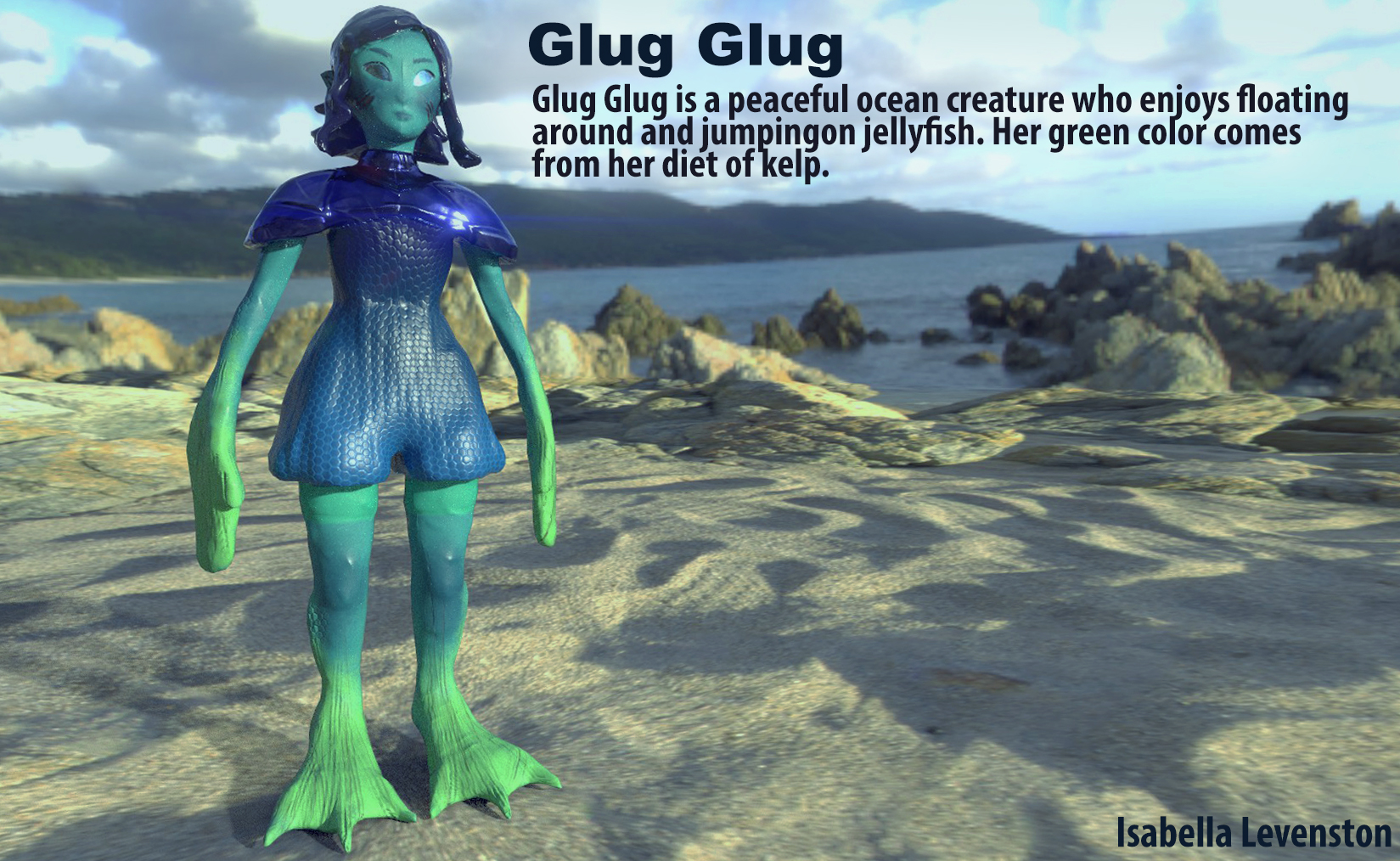 The most difficult step for me was creating a character. I made a 2D sketch which was hard to translate into 3D. I had to make a few adjustments to the design to make it sculptable and animatable. Below is the character bio which I created using a render from Substance Painter.