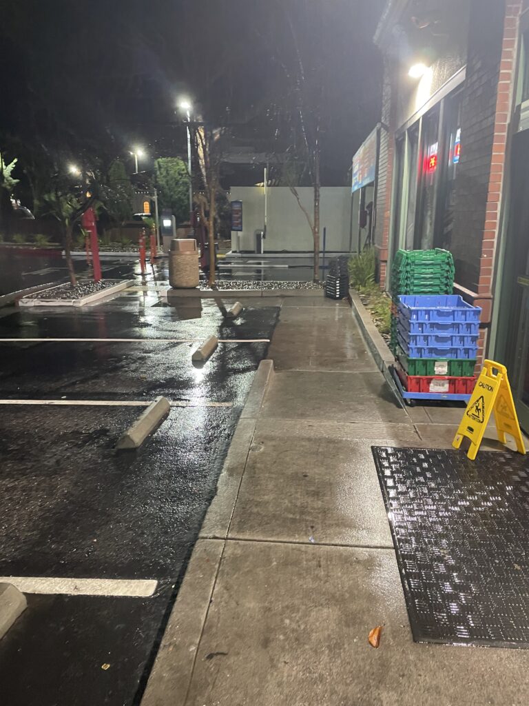 This photo was taken outside the entrance of a gas station, with the photo consisting of 3 major points, the parking lot, sidewalk, and gas station itself.