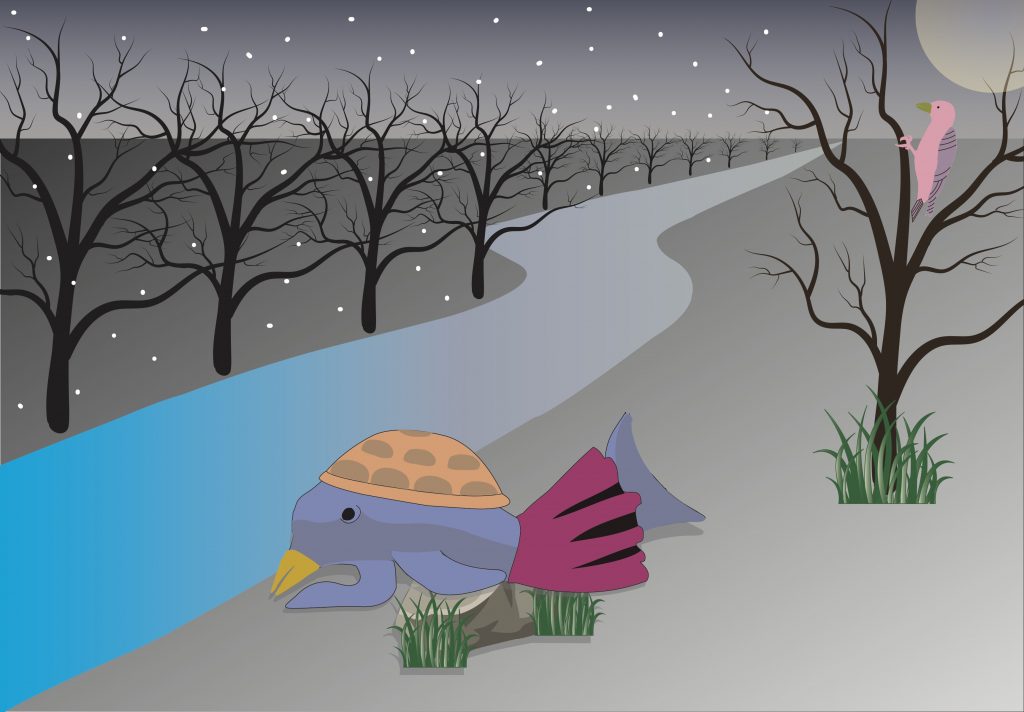 In my original sketches, I combined a dolphin, turtle, and canary. The dolphin was because she was elegant and graceful while also radiating power, the turtle because she started off as shy and unconfident, and the canary beak to illustrate her beautiful voice. One of the biggest issues I ran into while trying to actually draw my animal in Illustrator was how to put her in clothes. If I had more time, I would have tried to put a jacket on her but overall, I’m happy with the way she looks. I used linear perspective in my background to give the illusion of a 3D world. I tracked my river and row of trees back to a point on my horizon line and made the trees smaller and smaller to make it look like it was going off into the distance. To create both my character and the background, I mainly used the pen tool on Adobe Illustrator to trace images I found online, then make my own alterations using the brush and puppet warp tools. The background is split into a dull, gray side of the river and a more bright, prosperous side where the dolphin and the bird are. This was done to show how Allegra has the ability to make any place more beautiful with her presence, and even more so her voice.