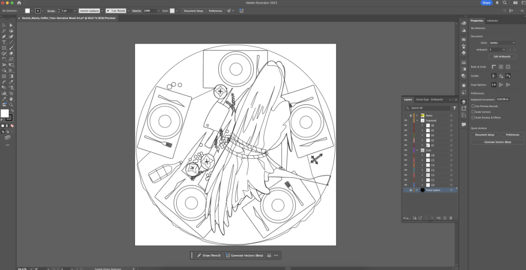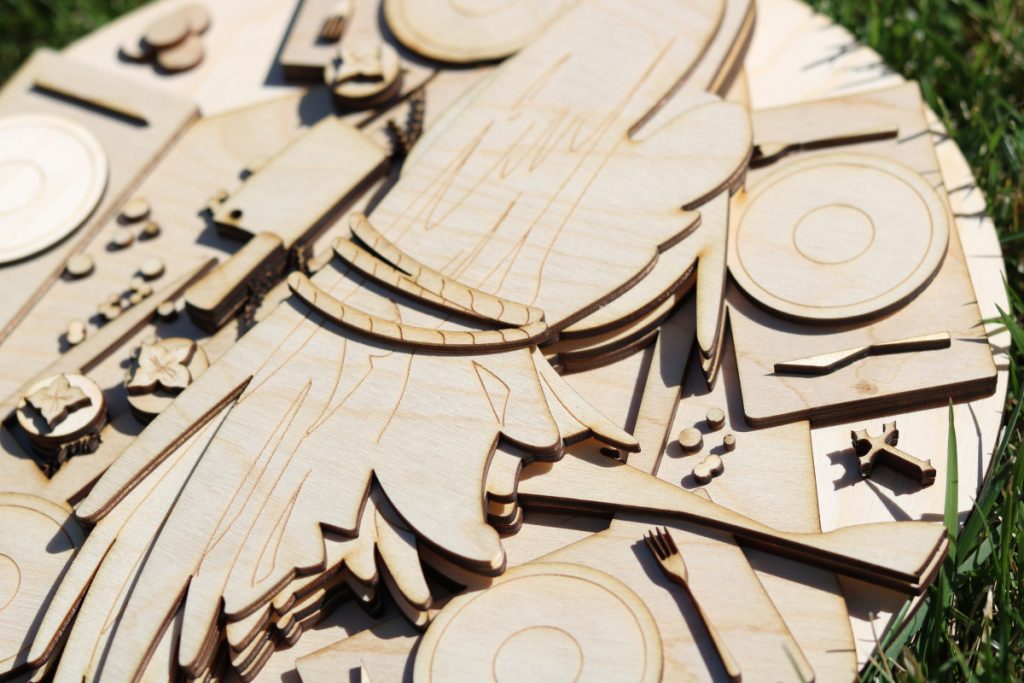We connected our wood art to our world-building by depicting the angel hunters gathered at a table, eating angel meat. We designed a bird’s eye view of the table, showcasing five plates, one for each hunter. Transforming our 2D art into 3D was both time consuming and confusing, especially since the layers in Illustrator became complex. We ran into issues with duplicate lines, which I had to manually delete one by one, taking up a good amount of time.