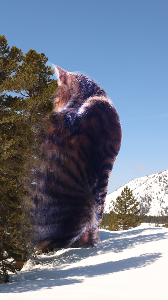 For the cat, I wanted to show my love for cats and snow. I had a picture of a tree that I had used for a photo blog and realized the branches aligned with my cats stripes. I used a mask on top and white strokes with different opacities to blend the cat into the tree to create a smooth seam. I also changed the direction of light on the cat to match the shadows on the floor. It was fun to use the masking strokes really carefully to get a precise effect. I’m happy with the result, and it’s not really funny but I think its a happy image that is kind of fun.