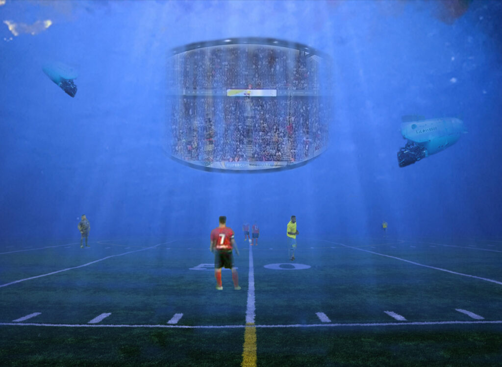 For the surreal digital art composition I wanted to create an underwater soccer game. I started by using my photograph of a soccer field and putting an image of the surface of the ocean behind it. I made this a mask and smoothly blended the images together to give the effect the field is underwater. Then I added player cut outs and similarly blended the ocean with them to give the same effect. Then I took an image of an audience and an image of a glass wall and put these together to create the feel of an underwater viewing room. I also added submarine cameras. Then I added highlights and shadows on everything in accordance with the lighting from the water image.