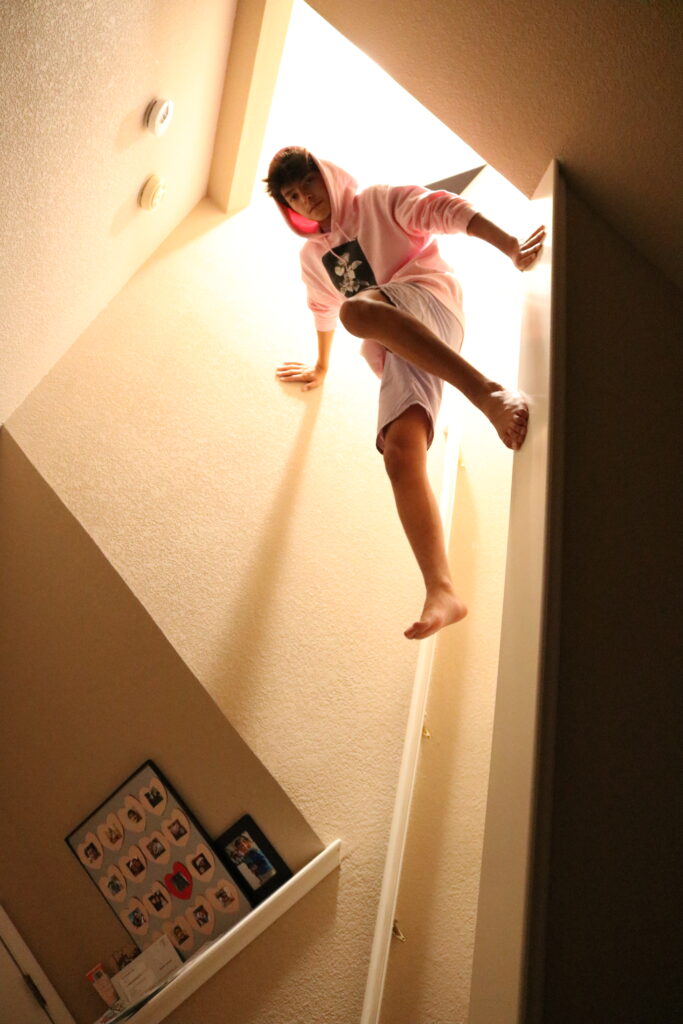 This photograph was an attempt to capture motion in a still image using the rule of thirds. I had my brother scale the railing of our stairs and pose at the top, while I angled the camera to make it seem as though he was hanging just below the ceiling. The only light source were the hallway lights behind him, which created shadows in the downward direction that also contributed to the illusion of motion.
