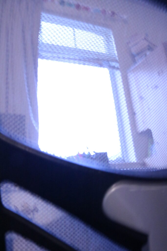 To start this composition, I brainstormed different perspectives that I could take a photo from. I was drawn to the window in my room because of its interesting surrounding and the light it shone on the rest of the room. After some experimenting, I had the idea to use the mesh on the back of my chair to add interest to the image. By taking a photo through the chair, I could not only take advantage of the interesting structure made by the solid parts of the backrest, but also create a fuzzy, somewhat distorted filter over the rest of the composition. To me, the final result is somewhat disorienting and confusing but ultimately pleasant and comfortable.