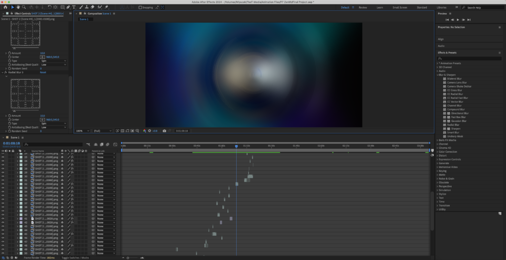 Once I finished animating and started collecting my renders I began editing everything together. I did all of this in Adobe AfterEffects. I mostly used abrupt cuts and used most of my raw renders, putting them together and cutting off some frames to make smoother transitions. I also did some fade interpolations on parts I wanted to be slow and gradual. Finally, on some of the dream sequence shots I messed with the time stretch, exposure, and radial blur effects to create the visual and intensity I desired. Overall, my editing was pretty simple because my renders were mostly complete but it was fun to put everything together and work on all the transitions.