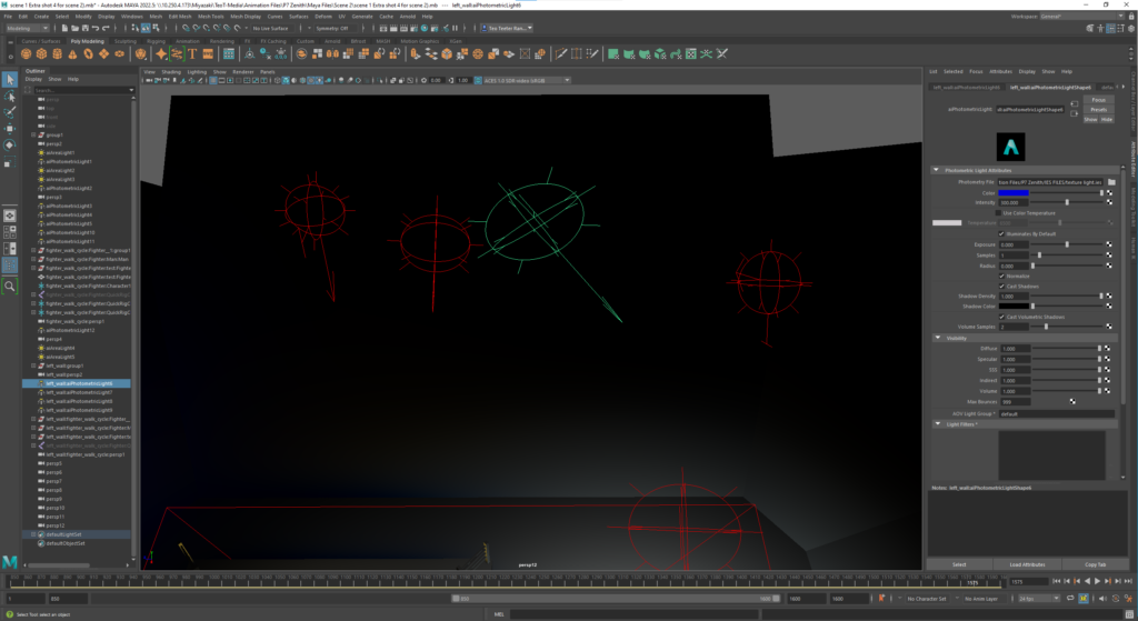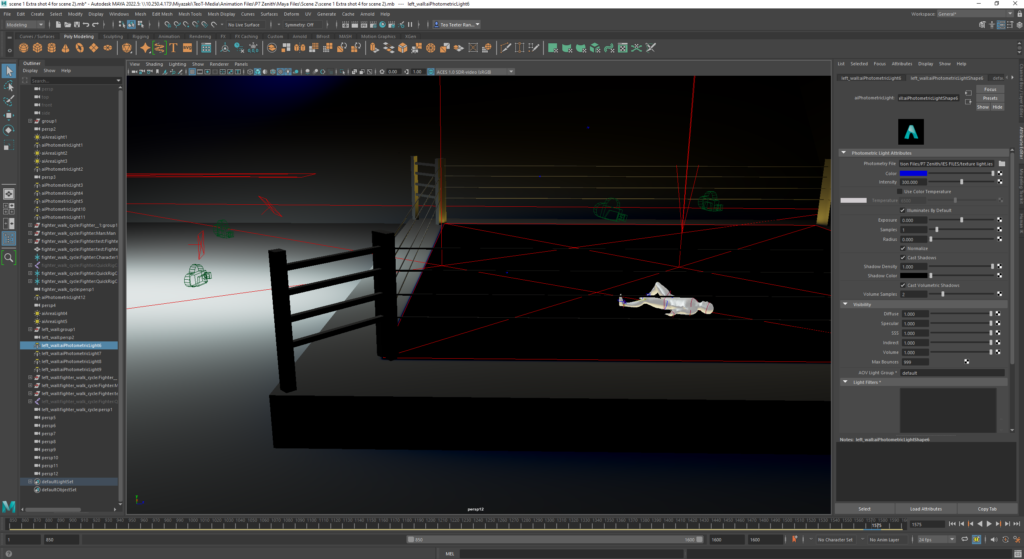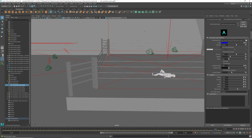 Finally, it was time for the focus of this project: lighting. I used a combination of area lights and photometric lights to create my visual. In addition, I animated all of the photometric lights to create different effects. In the dream sequences, these lights are shaking chaotically to evoke feelings of panic. In the real life, I used these in a more controlled way for flashing effects and high contrast shots. Unfortunately, to get what I wanted I had to spend so much time on lighting. Small differences in light placement and camera angles completely changed the shot, and since I was animating the camera I had to make sure the lights were in the right place for an aesthetic shot in all the different camera shots. This meant a ton of trial and error, where I would set up the camera and lights and then render the scene at various points to see how it looked, and then make small adjustments and render again.