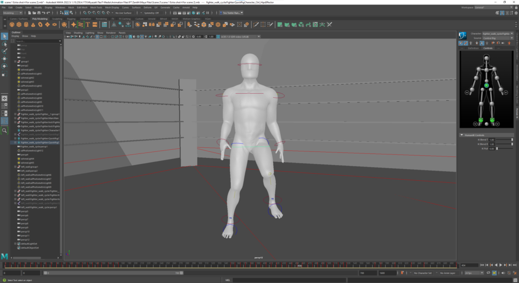 After modeling my character, I designed a tunnel, stadium, and boxing ring in Maya with simple shapes. I scaled everything to maintain consistent proportions, and then started modeling my scenes in the city. I modeled an alleyway and then found some garbage can and dumpster models for free on on TurboSquid and added these to my alley. Then I added building models from my narrative animation, and assigned these a shiny silver texture to fit my black and white aesthetic. Since the focus of this project was the lighting, I did not worry too much about the texturing of the models, and kept everything pretty simple to fit the visual style. This was helpful because it meant I could do this quickly and have a lot of time to spend on the animation, which I ended up needing.