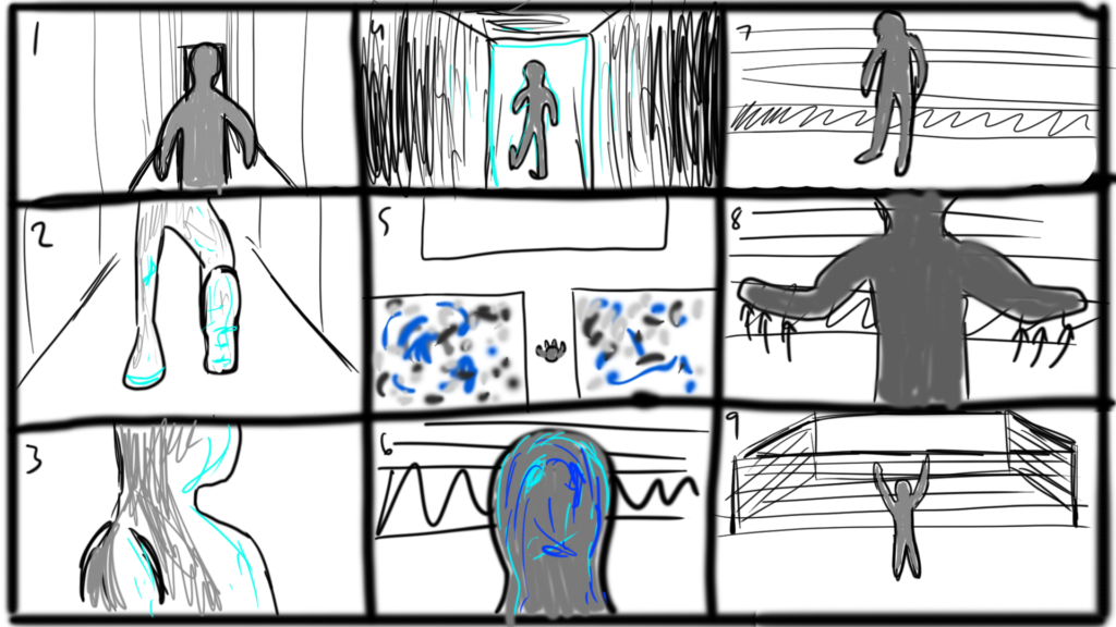 The first thing I had to do was figure out the story I wanted to tell. I had a lot of ideas already floating in my head, and I chose the final concept based on how effectively I would be able to convey the important ideas with animation. I chose my idea of a former boxer who is experiencing severe trauma after being knocked out in the ring. To tell his story, I decided to start my animation with shots of him entering a boxing ring. These shots would accelerate in speed and intensity as he gets closer and closer to the ring, until the chaos peaks. Then I would cut to shots of him in the real world, lost and confused, wandering aimlessly through a city. Eventually, he would enter back into his dream, and as we reached the start of the fight he was entering we would discover the source of his torment: he was knocked out.