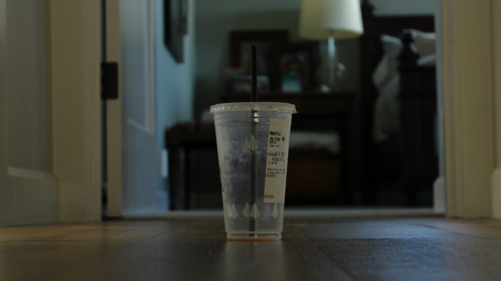 This is a picture of an empty coffee cup, standing alone in a hallway. This image depicts loneliness through its wide center frame composure. The solo plastic cup standing by itself surrounded by nothingness very much isolates the subject. Along with this, the empty cup, and the dark nature of the shot also add to the isolated and lonely feeling.