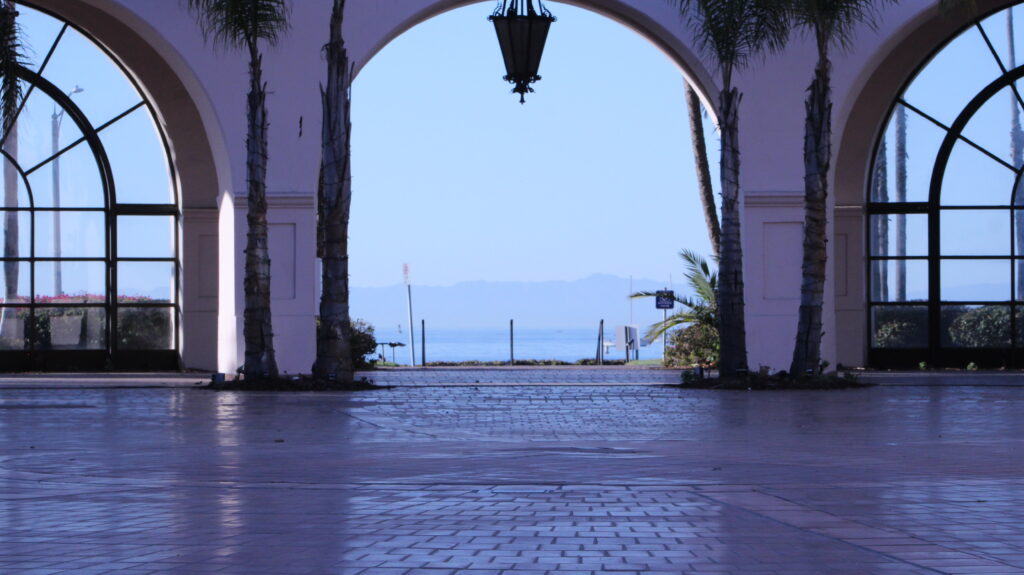 The view out to sea from an archway in Santa Barbara, California.