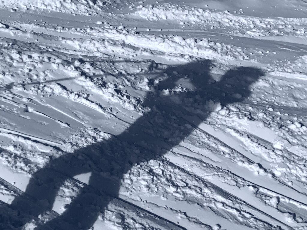 This image depicts a skier on the slopes. Their shadow is reflected downhill, and is shown on the snowy ground. This image uses shadows and the surrounding scenery (the snow covered ground) to tell the story of a a skier. The textured ground also gives the image some personality, and gives the shadow an interesting shape and distortion.