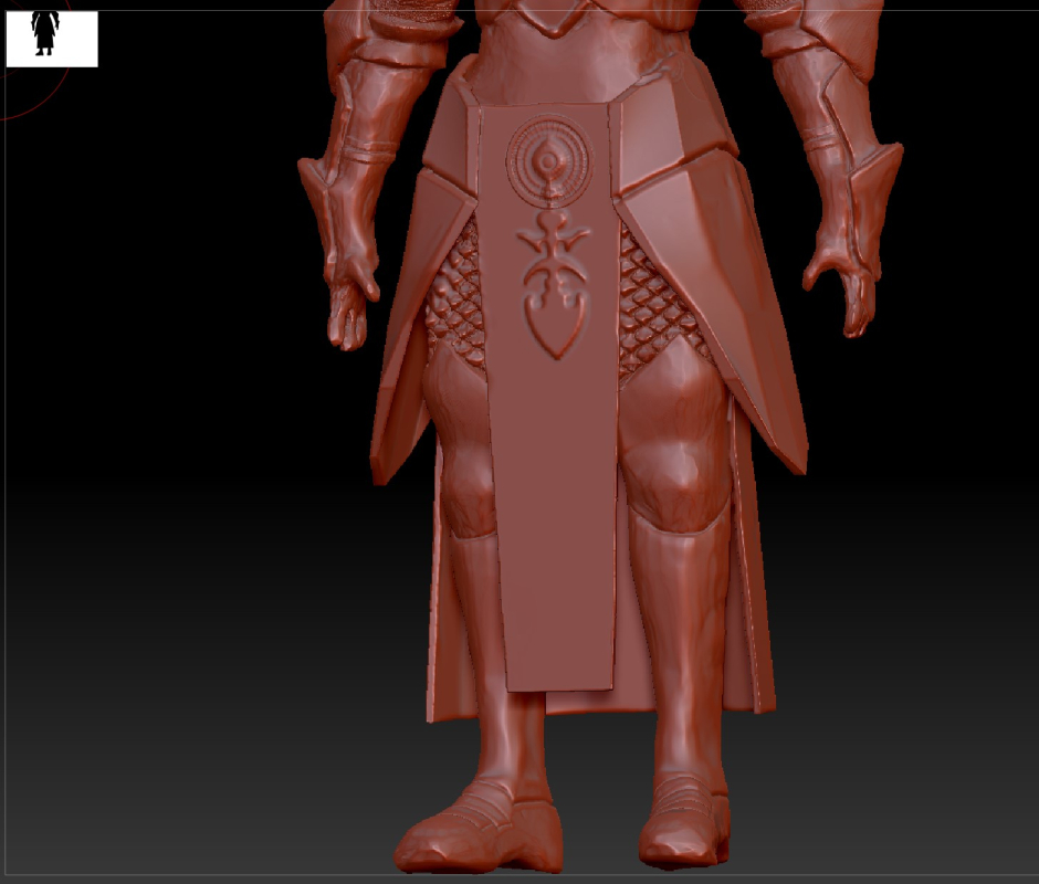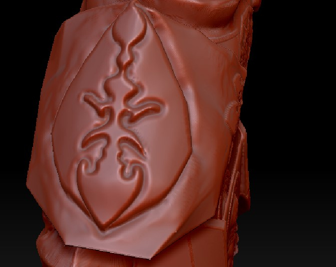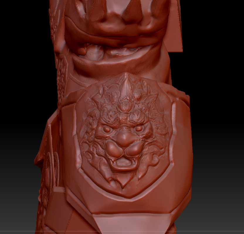 For the intricate patterns on the model, the best method was to find ready-made images from a texture library and stamp them directly onto the surface. I tried this technique on the scale armor—it worked really well. However, it didn’t work as effectively for more complex elements, like the lion head on the shoulder. Since the stamped image is flat, I had to manually add depth and layers to give it a three-dimensional feel. That part took a long time.