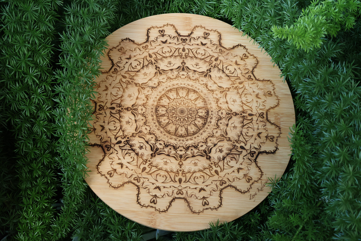 I really like how my mandala turned out; it was very much how I expected it to turn out compared to my digital version. However, the laser-engraved mandala showed less detail than I had anticipated. The inner circles of my mandala looked a lot more crowded on the bamboo compared to my digital version. Instead, I wished I spent more time on the outer circles rather than the innermost one. The look of wood is what I envisioned for this project, and I am not a fan of the visual and textures from the plastic leather or acrylic ones, so it was between bamboo and wood. But the wood wasn’t guaranteed to be circular, which I really wanted, because it would bother me since my mandala is symmetrical. I wanted the material to also be symmetrical, so I chose the bamboo one for a wooden circle. Looking at the final result, which I wanted burned on wood, I like how it turned out, but if I were to change anything, I would make the center less dense. Overall, the mandala’s border and the wave design are probably my favorite parts.