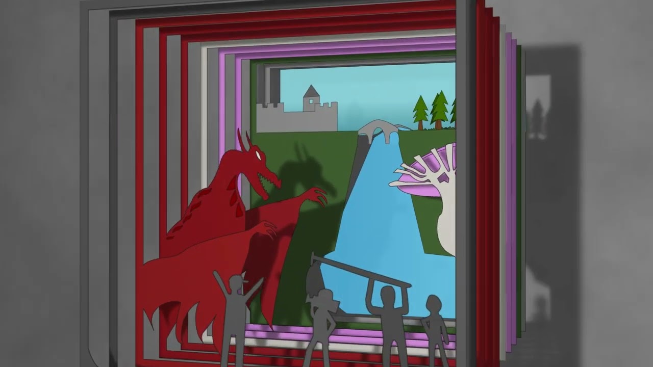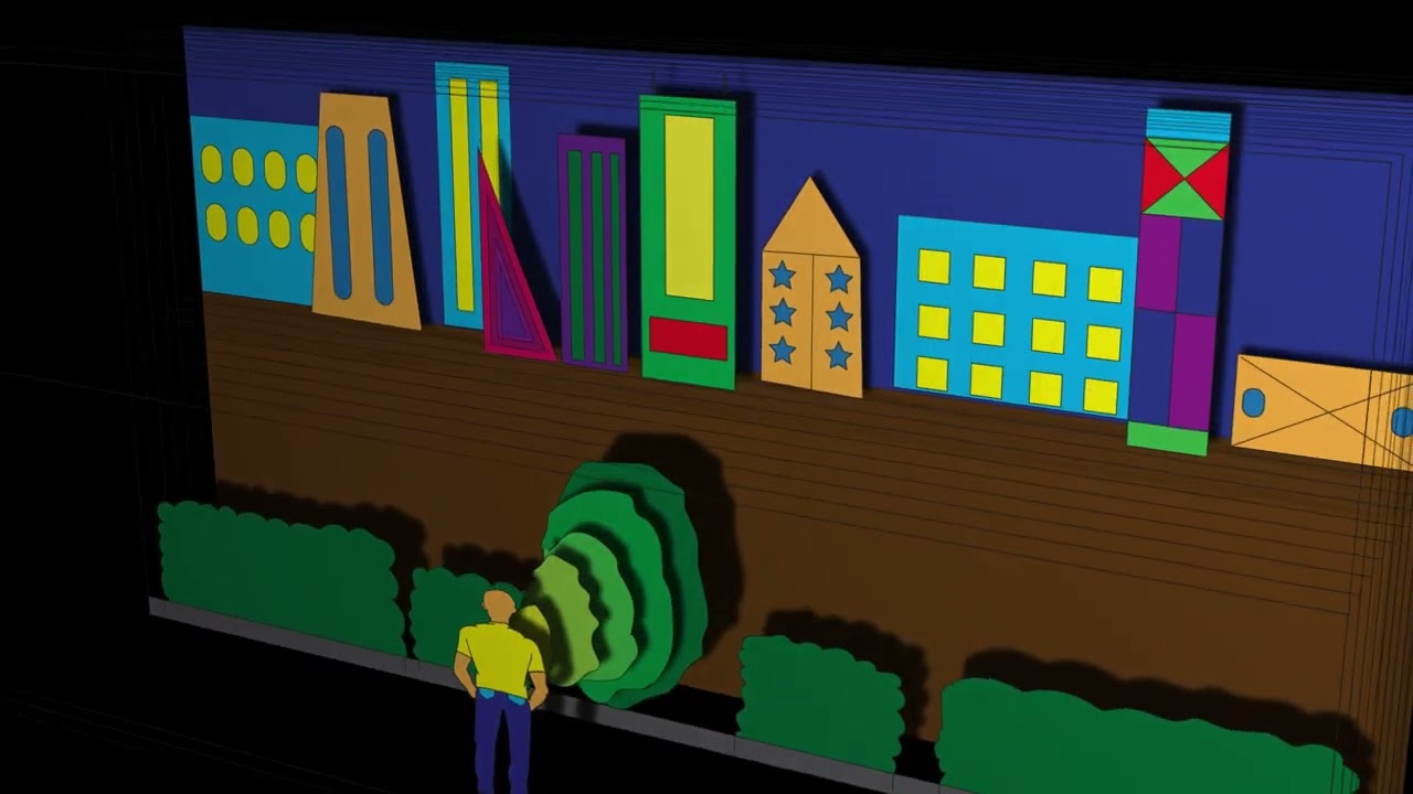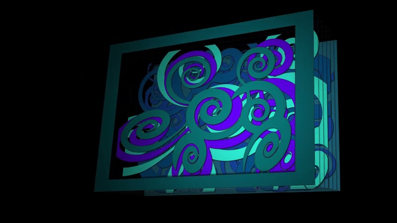 Continuing the study of 3D, students learned how to embed, lay out, and animate flat 2D imported illustrated art within 3D virtual space in Adobe After Effects that featured the same digital art for the laser cut project. They also added virtual lighting to cast shadows in the scene and finally animated virtual cameras into and around the 3D virtual space.
