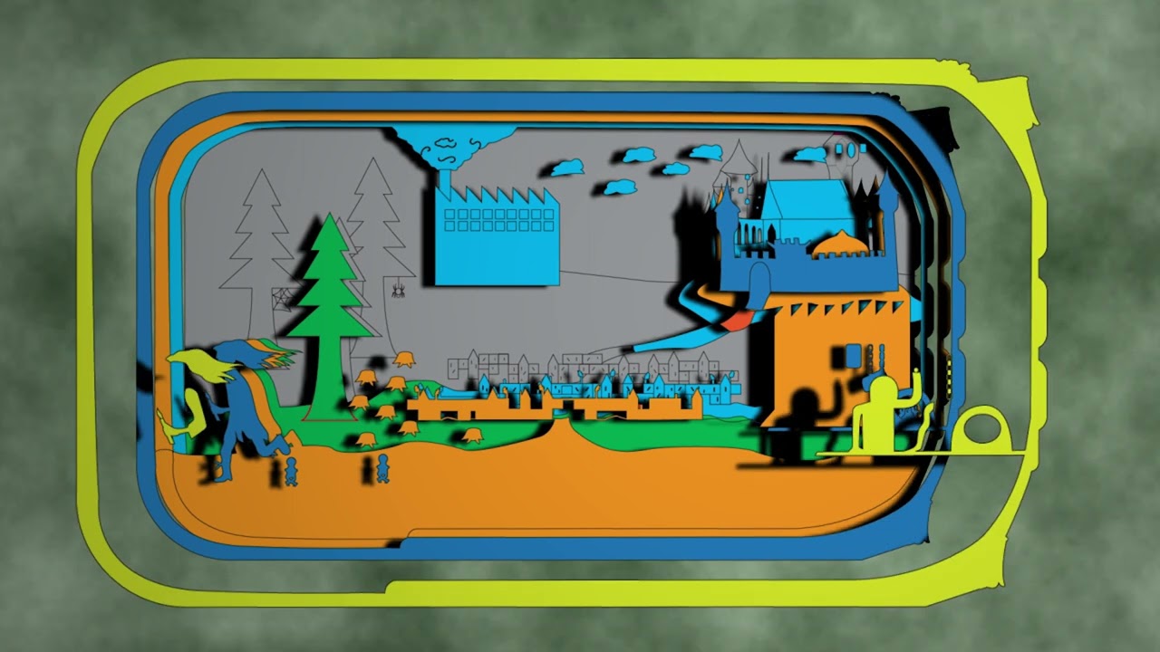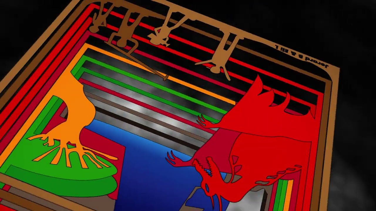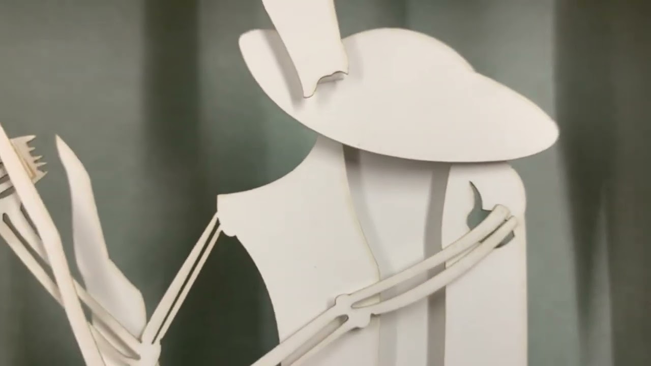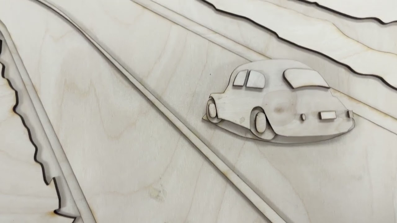 Continuing the study of 3D, students learned how to embed, lay out, and animate flat 2D imported illustrated art within 3D virtual space in Adobe After Effects that featured the same digital art for the laser cut project. They also added virtual lighting to cast shadows in the scene and finally animated virtual cameras into and around the 3D virtual space.