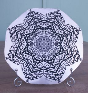 In Digital Media we made two mandalas using Illustrator, one was b&w and the other was colored. Our b&w mandala was laser printed on a material of our choice, mine being the rose gold metal.